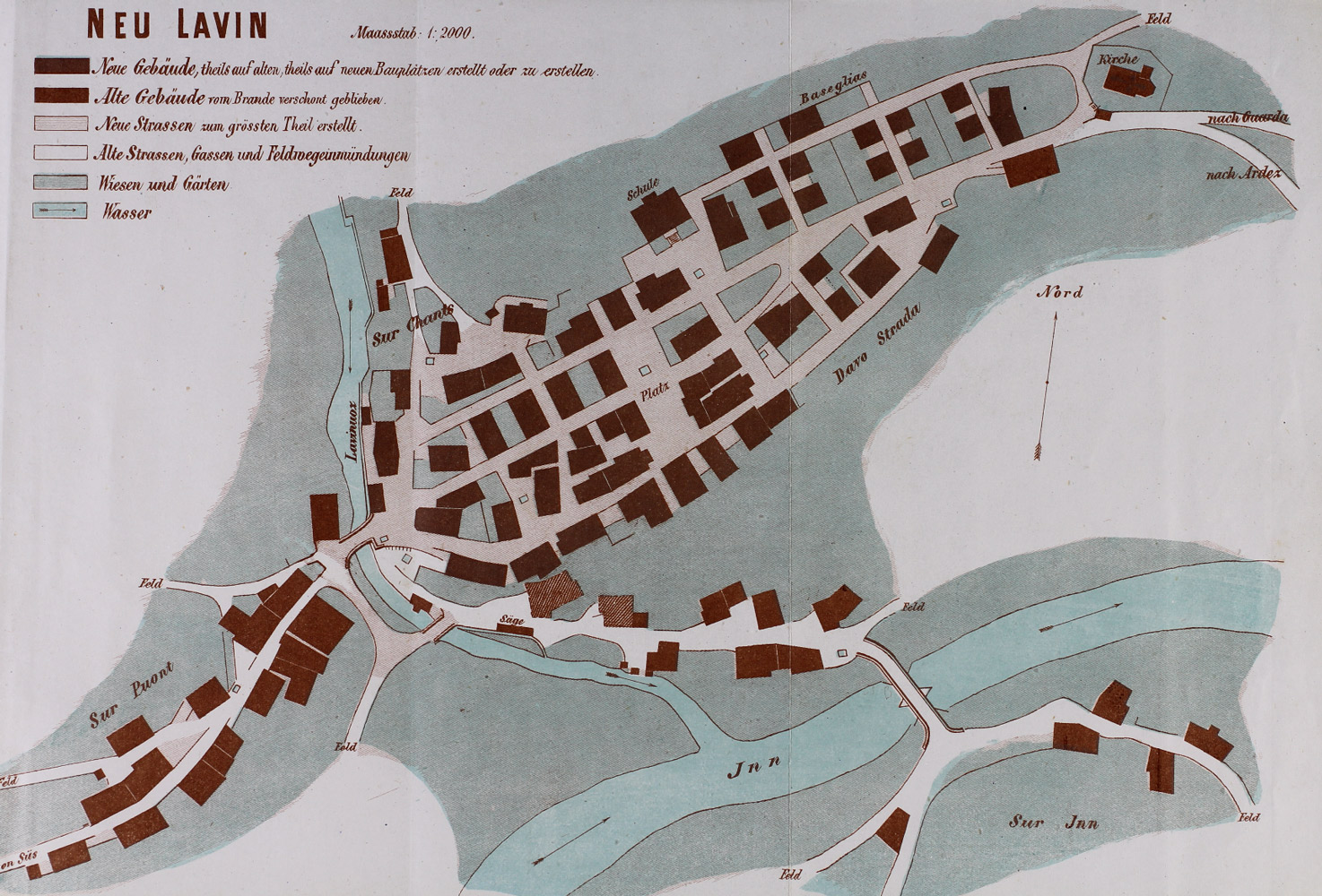 Die Frage nach der Ursache des Dorfbrandes von Lavin – ausgebrochen am Nachmittag des 1. Oktober 1869 – ist Gegenstand von Spekulationen. Die einen sehen Kinder, die mit dem Streichholz nach dem Murmeltier suchen, das sich im Dunkel des Heustocks verkrochen hat. Andere glauben zu wissen, dass Unachtsamkeit beim Buttersieden in der Bäckerei zum Brandherd wurde. Präzises liefert uns die Chronik zur Statur des Dorfes kurz vor dem Brand. Wir kennen die genaue Zahl von Wohnhäusern und Ställen, von Protestanten und Katholiken, von Kühen, Ochsen, Ziegen und Schafen. Noch präziser sind die Tabellen, die beim Wiederaufbau versuchen, im Wettlauf von Enteignung und Neuerwerb die Balance zwischen der individuellen Last des Schicksals und der kollektiven Raison des Dorfplanes zu finden. Die Steine im Schutt werden als Baumaterial mitgezählt. Kreislauf flüchtiger Fundamente.